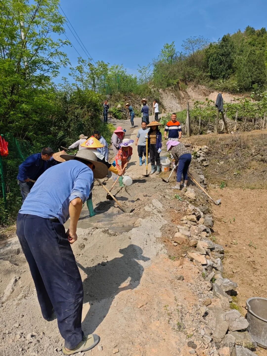 “一二三,加把劲!”晨雾还未散尽,紫荆村上洛邦处已传来此起彼伏的号子声。机耕道旁水泥搅拌发出沙沙声,村里男女老少,拿铁铲、挑泥沙,加宽路基、平整路面,好不热闹。